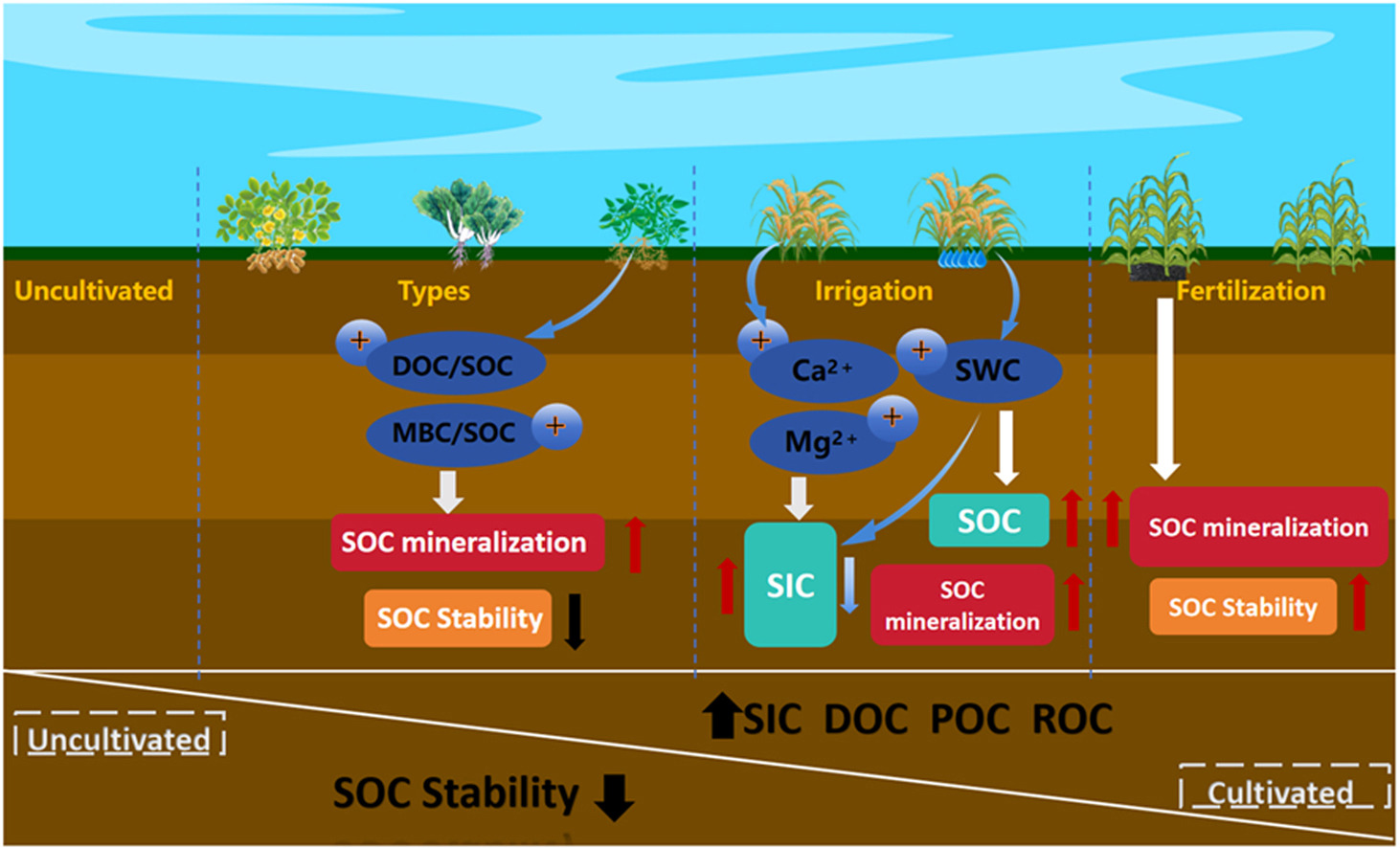 该研究以黄河三角洲未开垦及种植不同作物、采用不同管理措施的已开垦土壤样地为对象,系统分析了其碳固存能力及影响机制,并探讨了不同作物种植模式的响应规律,主要研究结果如下:(1)滨海盐碱土具有较强的碳固存能力,储存的碳主要为无机碳(SIC),约占总碳含量的 82%–96%;有机碳(SOC)主要以矿物结合有机碳(MAOC)形式存在;(2)土壤理化性质与酶活性是影响碳固存的关键因子。SIC 含量与土壤 pH、Ca²⁺、含水率(SWC)及 SOC-SIC转化速率密切相关。SOC 矿化受 SOC 稳定性(DOC/SOC、MBC/SOC、ROC/SOC)的正向影响,而受 MAOC/POC 的负向影响(P<0.05);(3)作物种植显著提高了滨海盐碱土的 SIC(5.81–21.46 g/kg)及活性有机碳组分(DOC、ROC、POC)含量,但降低了 SOC 稳定性(下降 22.3%–90.4%)。其中,水稻土壤 SOC 含量最高且稳定性最强,旱稻土壤 SIC 含量最高,大豆土壤矿化量最大但稳定性最低。(4)适度灌溉与生物炭施用有助于提升碳固存水平,但需警惕化肥过量引起的碳酸盐溶解和 SOC 矿化加剧。未来研究应综合考虑种植模式与管理措施,以定量评估滨海盐碱农田的碳平衡。